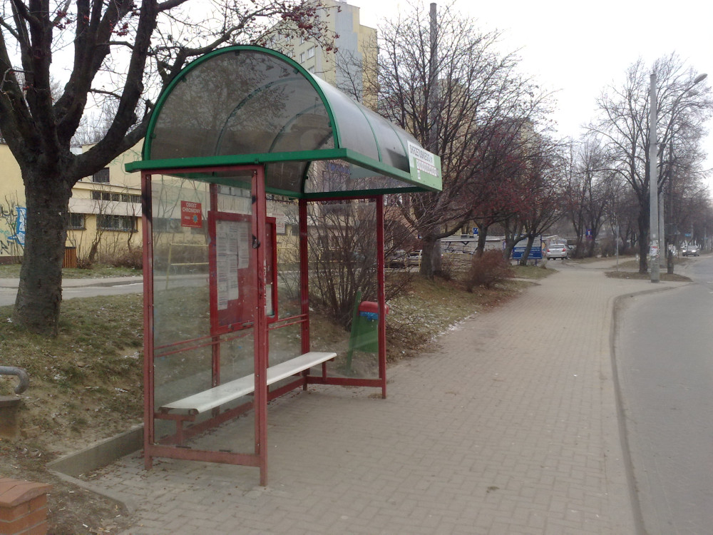 Przystanek Skrzetuskiego 01 - kosz na śmieci jest zniszczony - stoi krzywo, jest pomazany i przede wszystkim powyginany, co czyni bezcelowym jego odmalowanie - kosz ten po prostu musi zostać wymieniony. Natomiast cała metalowa konstrukcja wiaty jest wyblaknięta i mocno zardzewiała, nie była malowana już od wielu lat i obecnie pilnie tego wymaga.