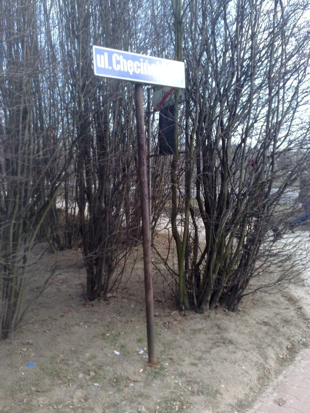 Stojący krzywo słupek z nazwą ulicy, dodatkowo słupek jest cały zardzewiały. Słupek powinien zostać odmalowany i wyprostowany lub wymieniony. Jest także trzecie wyjście (chyba najlepsze w tej sytuacji) - likwidacja całkowita tej tabliczki w tym miejscu i zamontowanie tabliczki z nazwą ulicy na latarni przy początku ulicy (słup oznaczony nr 96 stojący na rogu ulic Chęcińskiego i Kiepury, wówczas tabliczka byłaby także w końcu dobrze widoczna, ponieważ byłaby przy samym skrzyżowaniu, a obecnie schowana jest za krzakami.