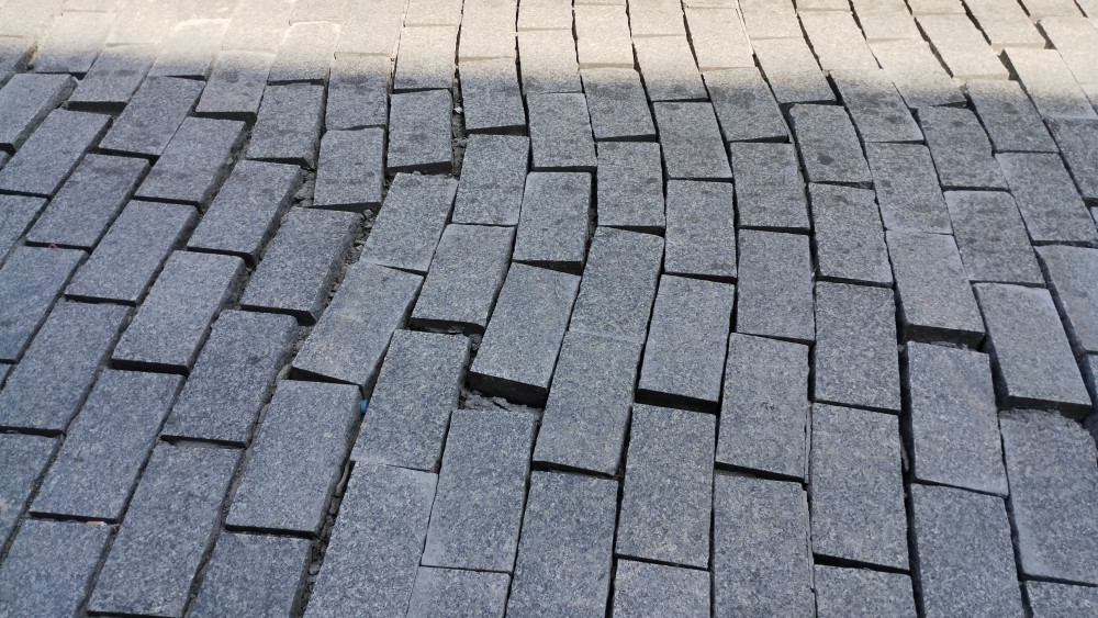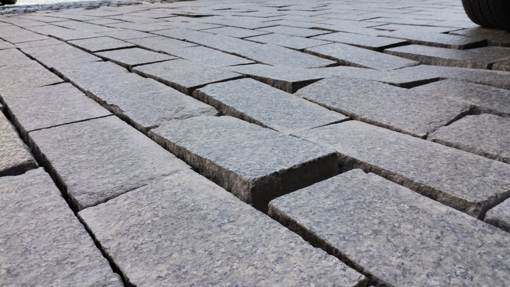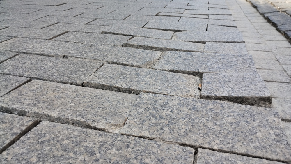 zniszczona nawierzchnia jezdni, dziury, uskoki, ruchome fragmenty kostki