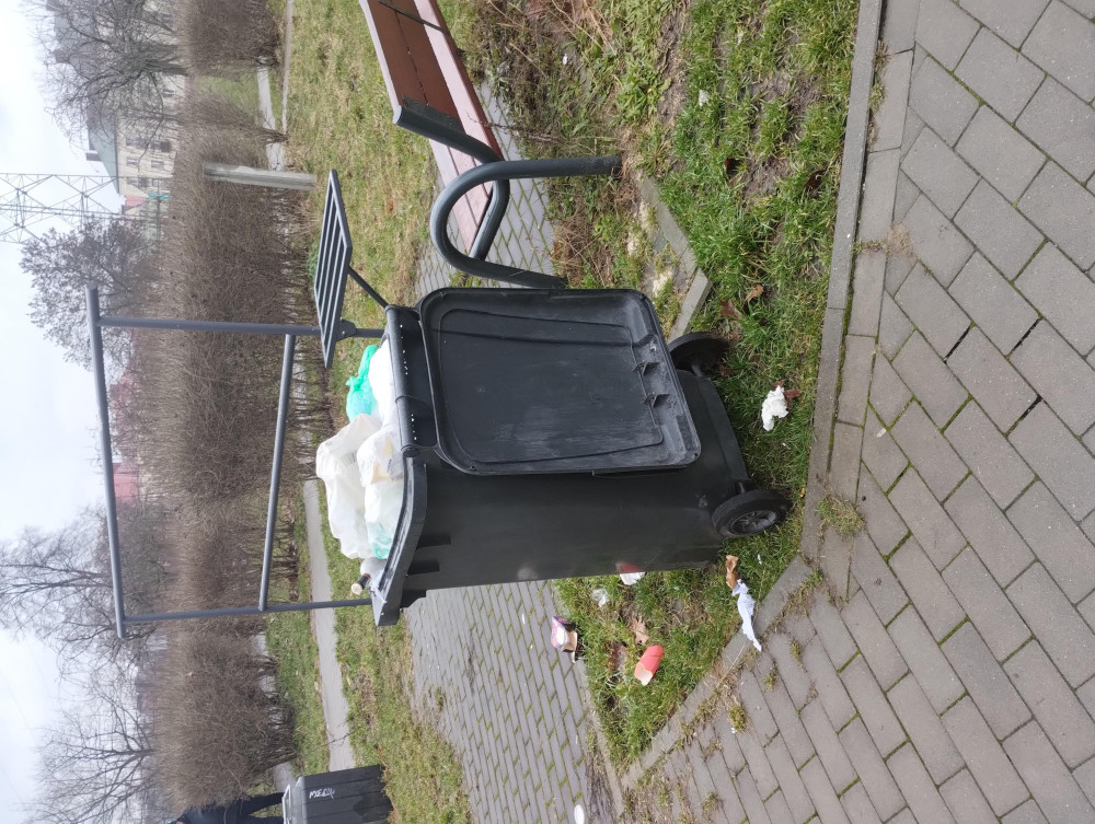 Pozostawiony i przepełniony pojemnik na śmieci oraz worki ze śmieciami