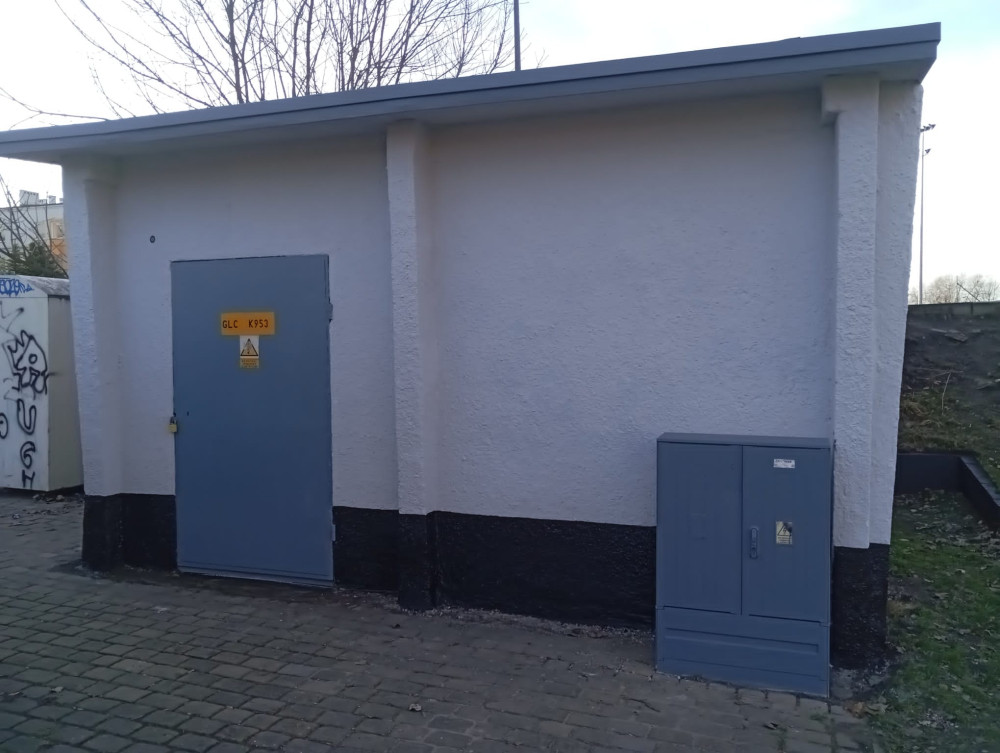 popisane skrzynki elektryczne, stacja transformatorowa; proszę o odmalowanie i usunięcie graffiti