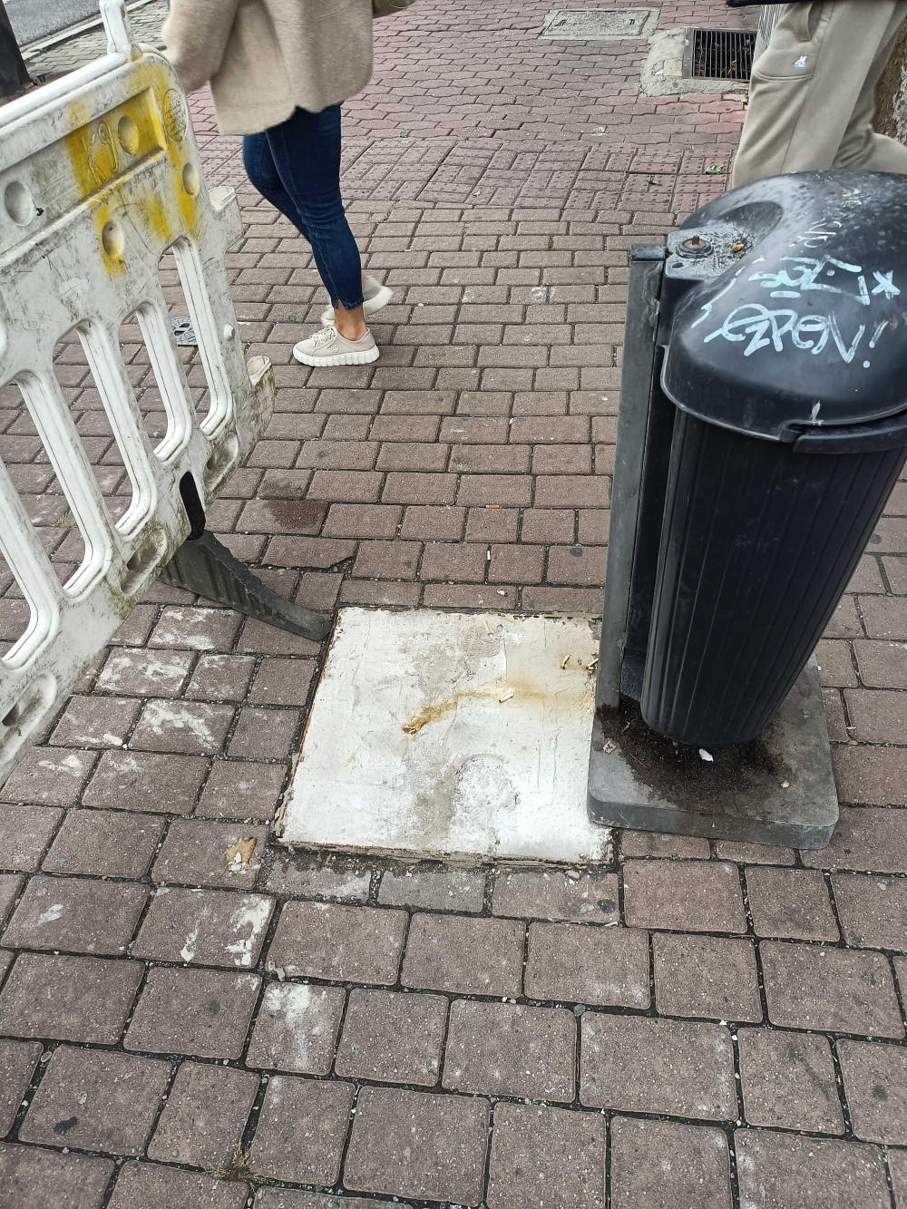 Proszę o zwrócenie się do właściciela o wymianę lub załatanie dziurawego włazu betonowego studzienki, być może elektroenergetycznej, przy budynku plac Oddziałów Młodzieży Powstańczej 1.