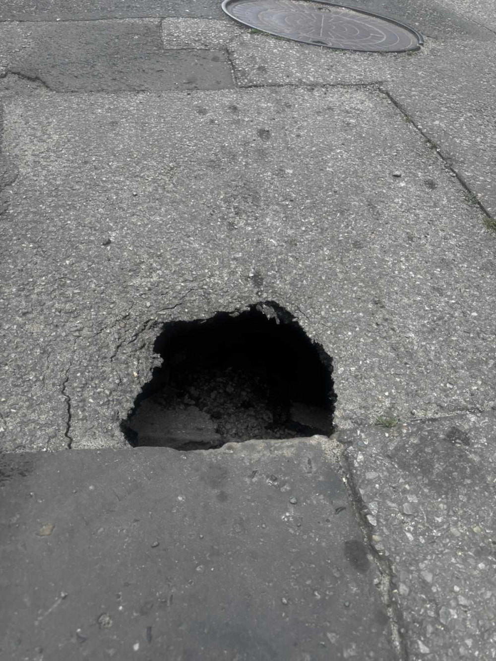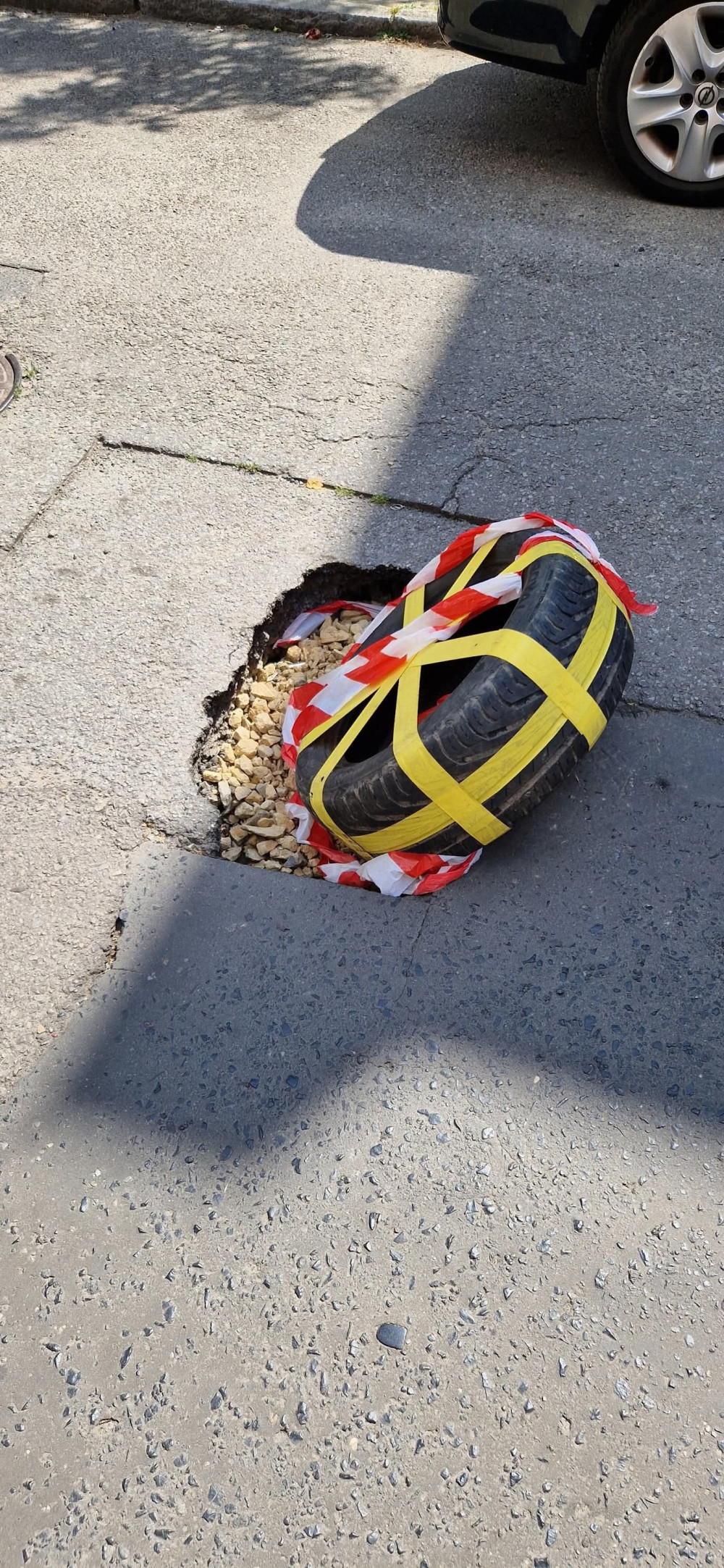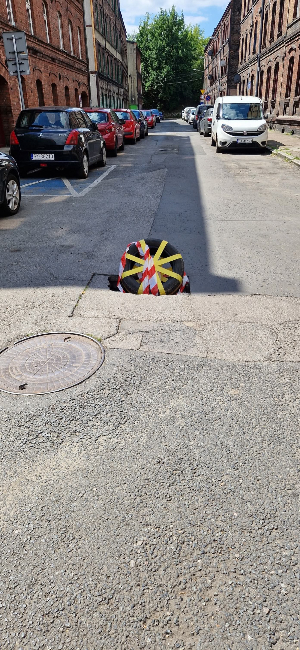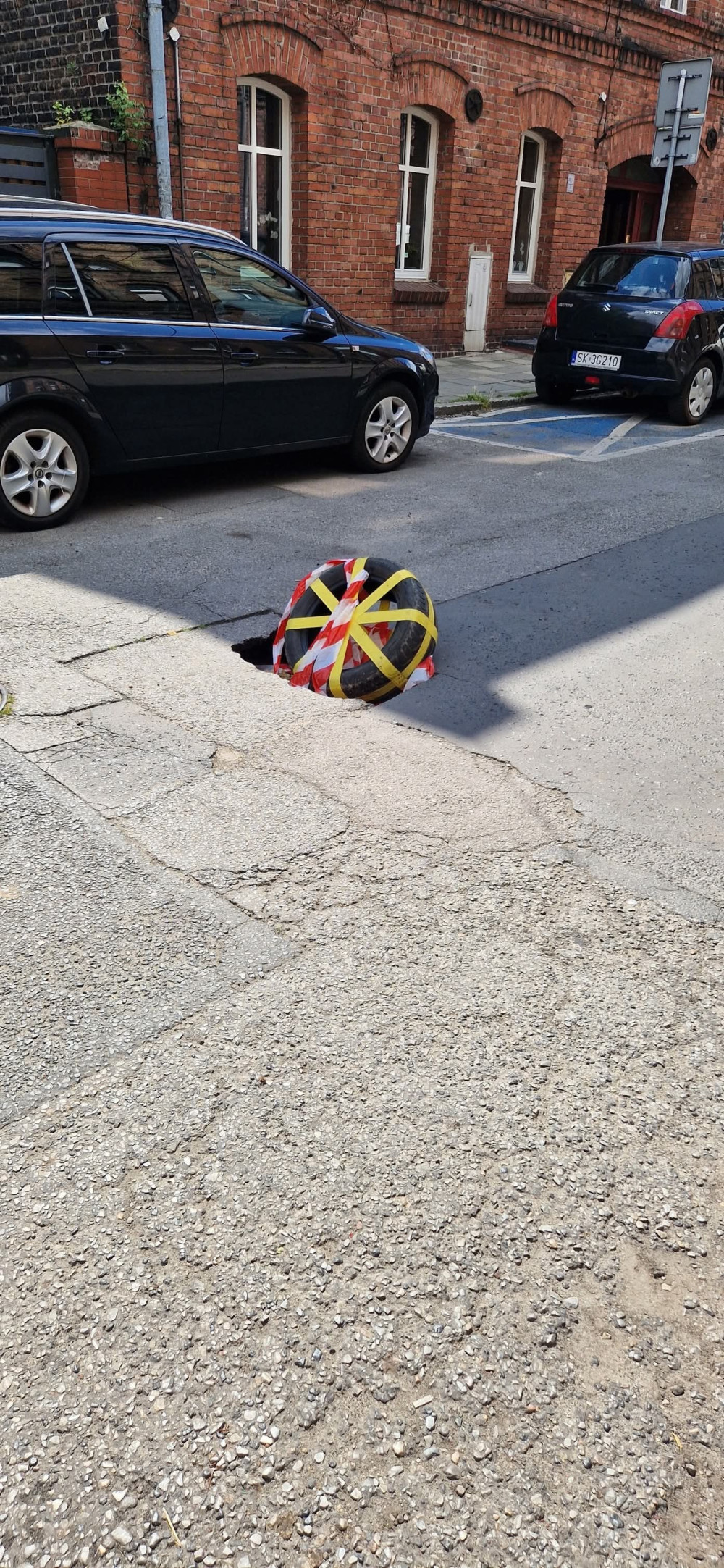 Na ulicy Janasa 11 jest uszkodzona jezdnia. Okoliczni mieszkańcy zabezpieczyli dziurę już na swój sposób umieszczając w niej oponę