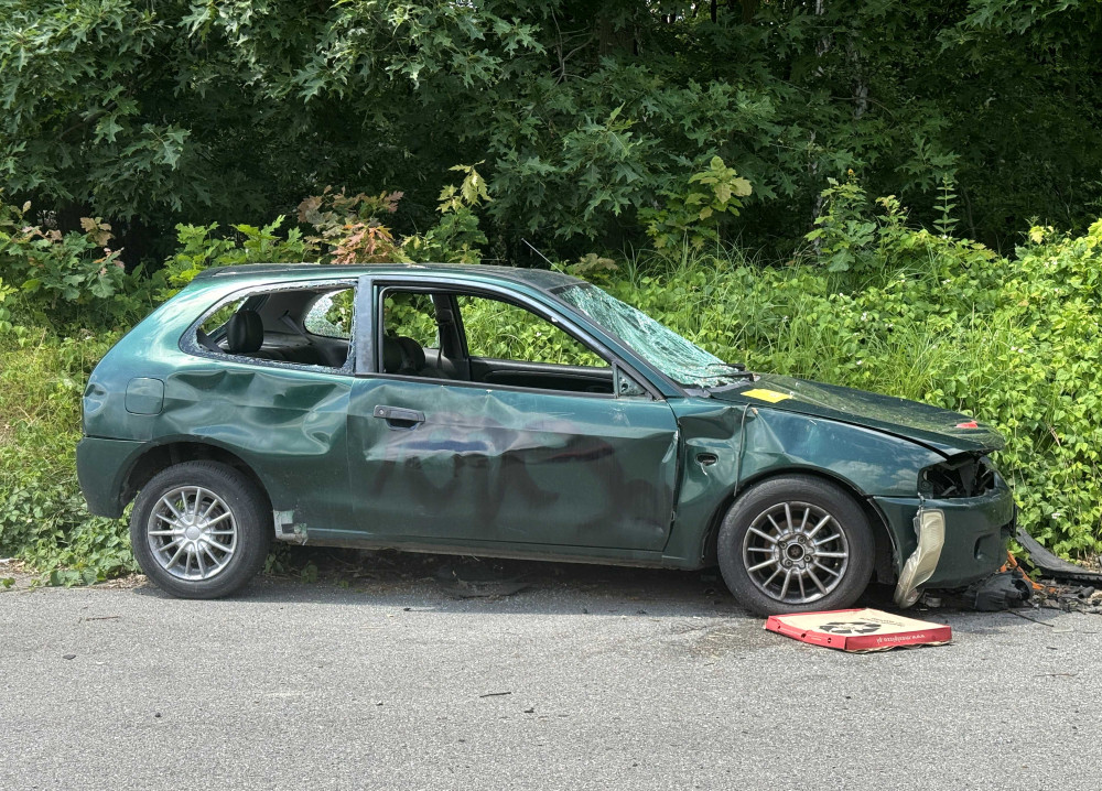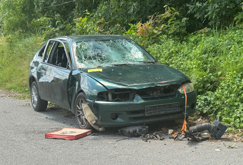 Porzucony i zdemolowany pojazd z którego prawdopodobnie wyciekają lub już wyciekły płyny eksploatacyjne mogące zanieczyścić środowisko.