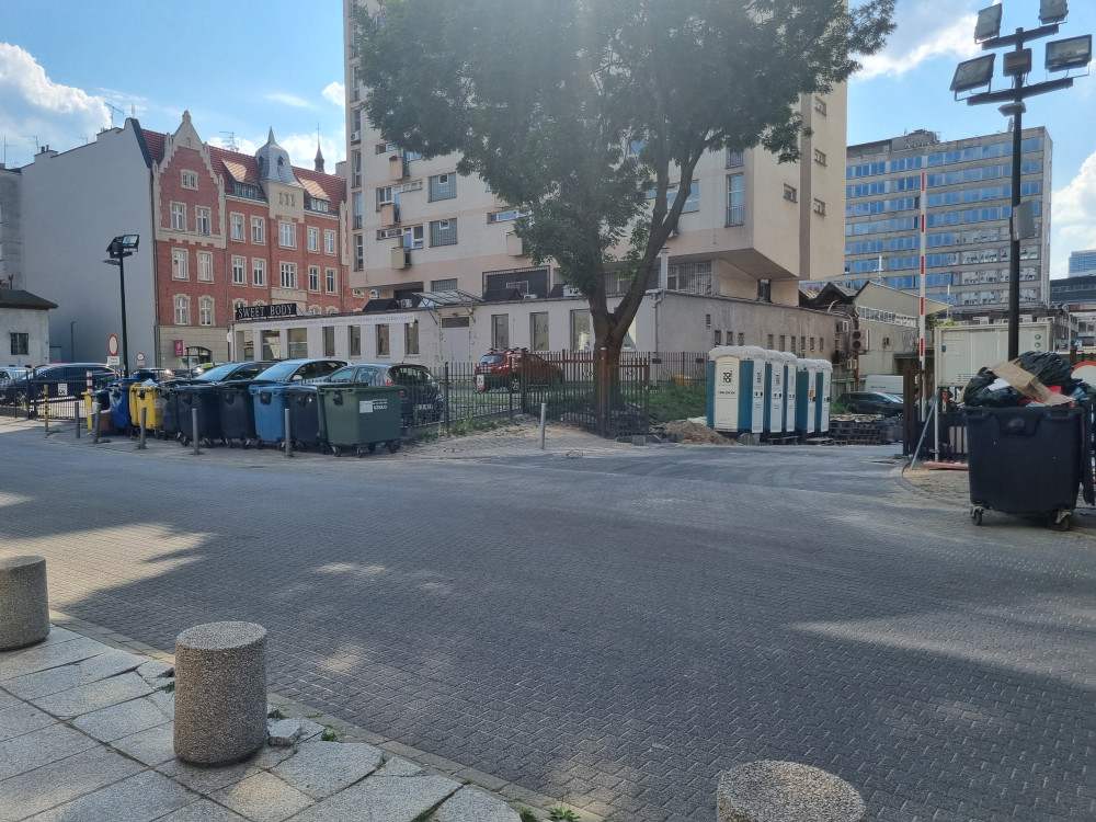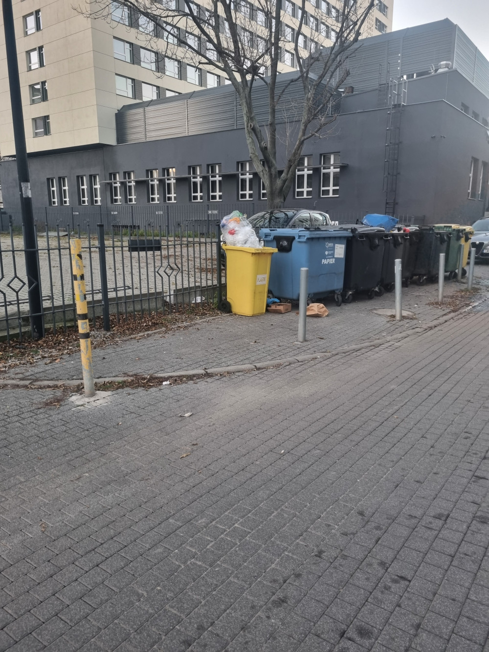 Kontenery na śmieci stoją na stałe na chodniku - nie moza przejść