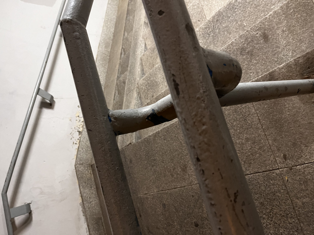 Balustrady na schodach do przejścia podziemnego (na każdym wejściu/zejściu do przejścia) są zniszczona. Farba odchodzi, łuszczy się, balustrady są odrapane.