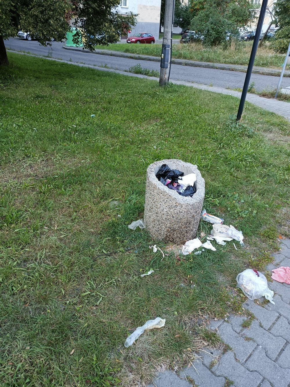 Prosiłbym o wymianę kosza stojącego przy skrzyżowaniu ul. Piaskowej oraz 1 Maja, bo można rozorać sobie dłoń na ostrych kamieniach, wkładając coś do środka.