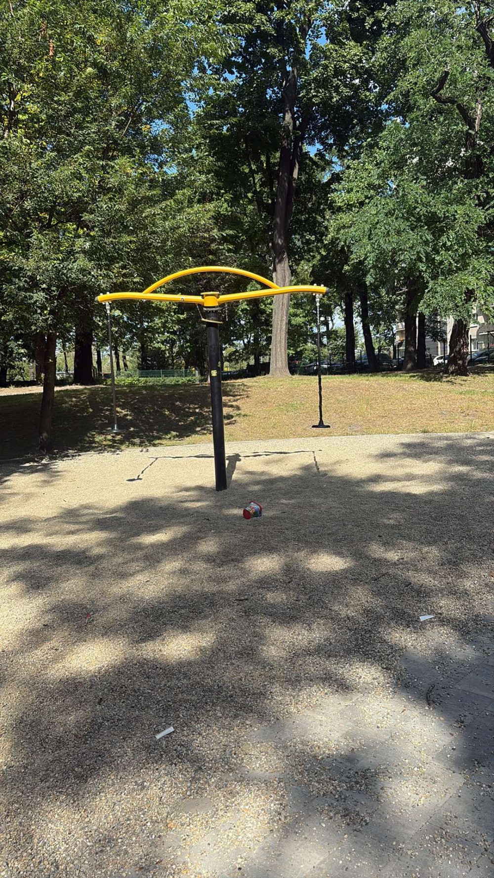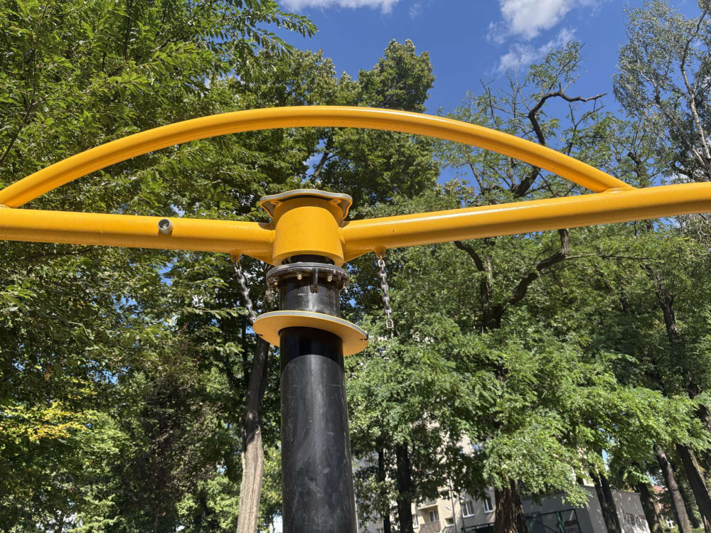 Na nowo otwartym placu zabaw w parku Załęskim na jednej z karuzel jest zerwany łańcuch