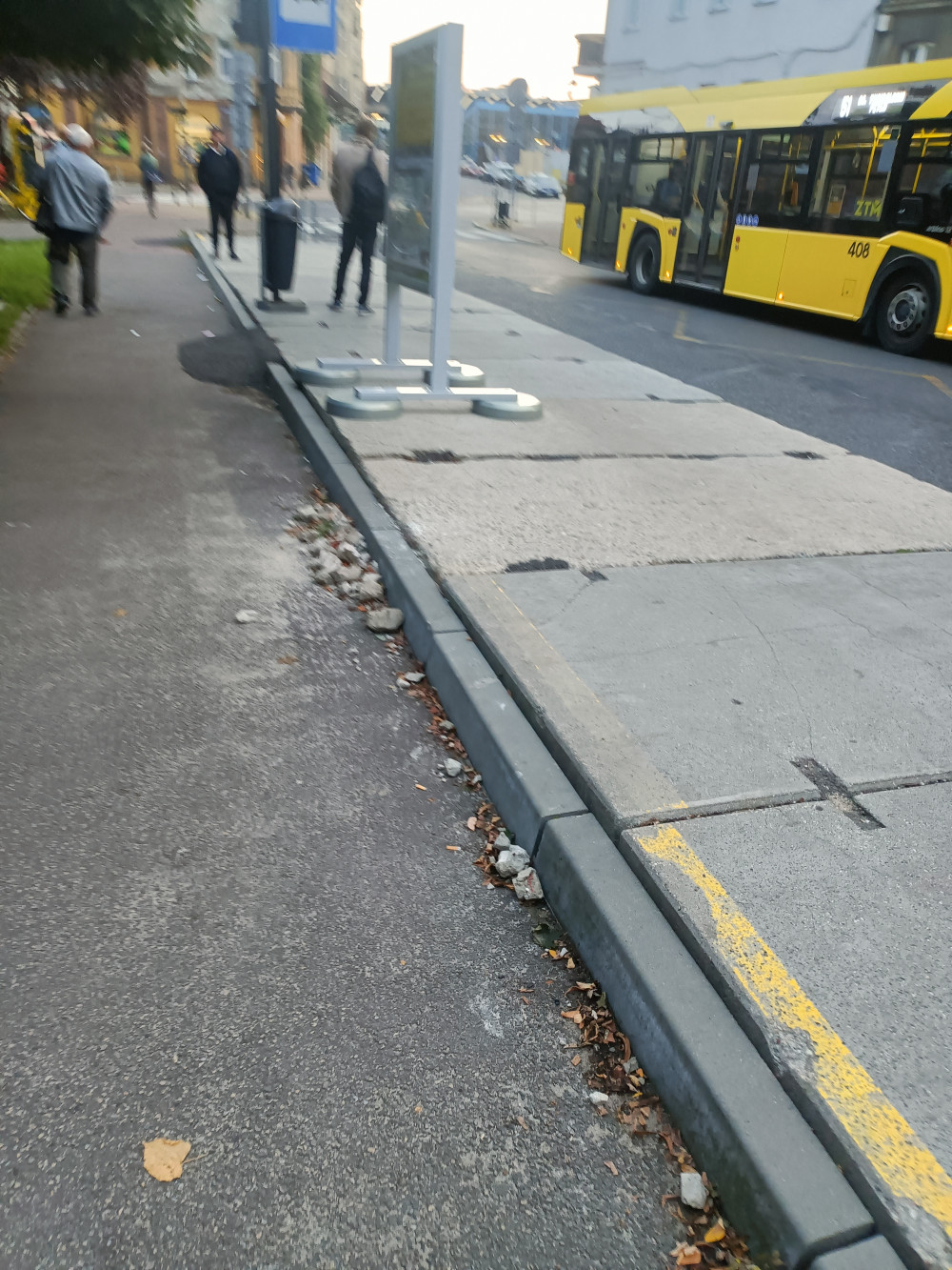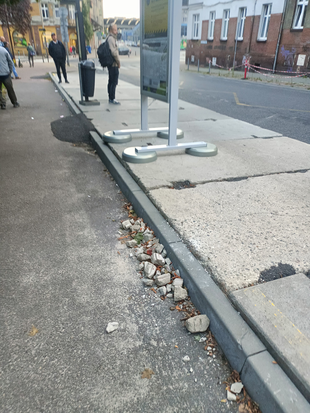 Prosiłbym o sprzątnięcie gruzu z chodnika ul. Skłodowskiej-Curie, na wysokości przystanków autobusowych Skłodowskiej Dworzec.