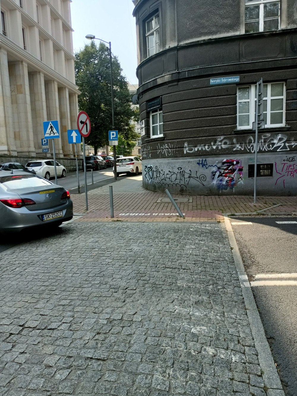 Prosiłbym o wyprostowanie słupka w obrębie przejścia sugerowanego przy skrzyżowaniu ul. Dąbrowskiego oraz Lompy.