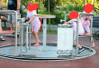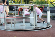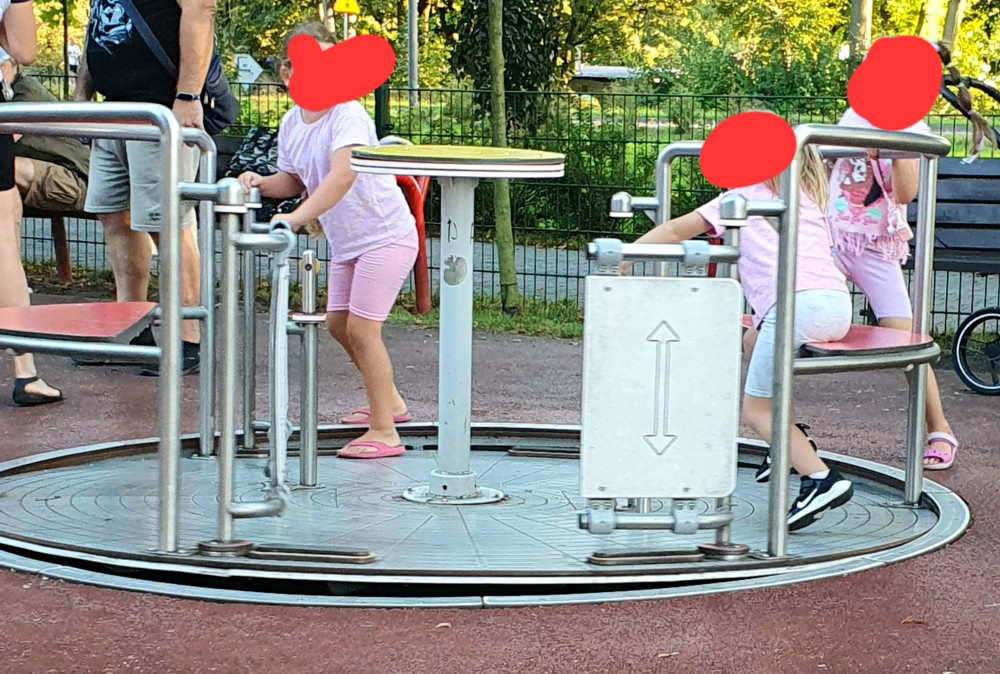 Uszkodzona karuzela na placu zabaw. Przechyla się na boki.