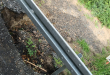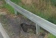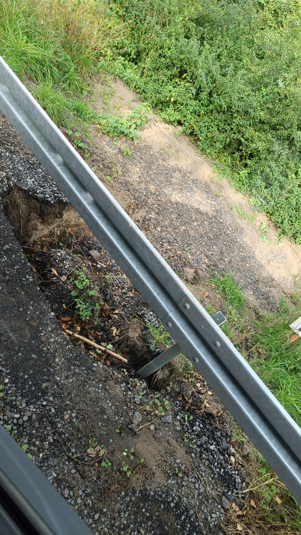 Po raz kolejny uszkodzone pobocze jezdni i wypłukany słupek barierki energochłonnej przez co nie spełnia swoich wymagań i zagraża bezpieczeństwu