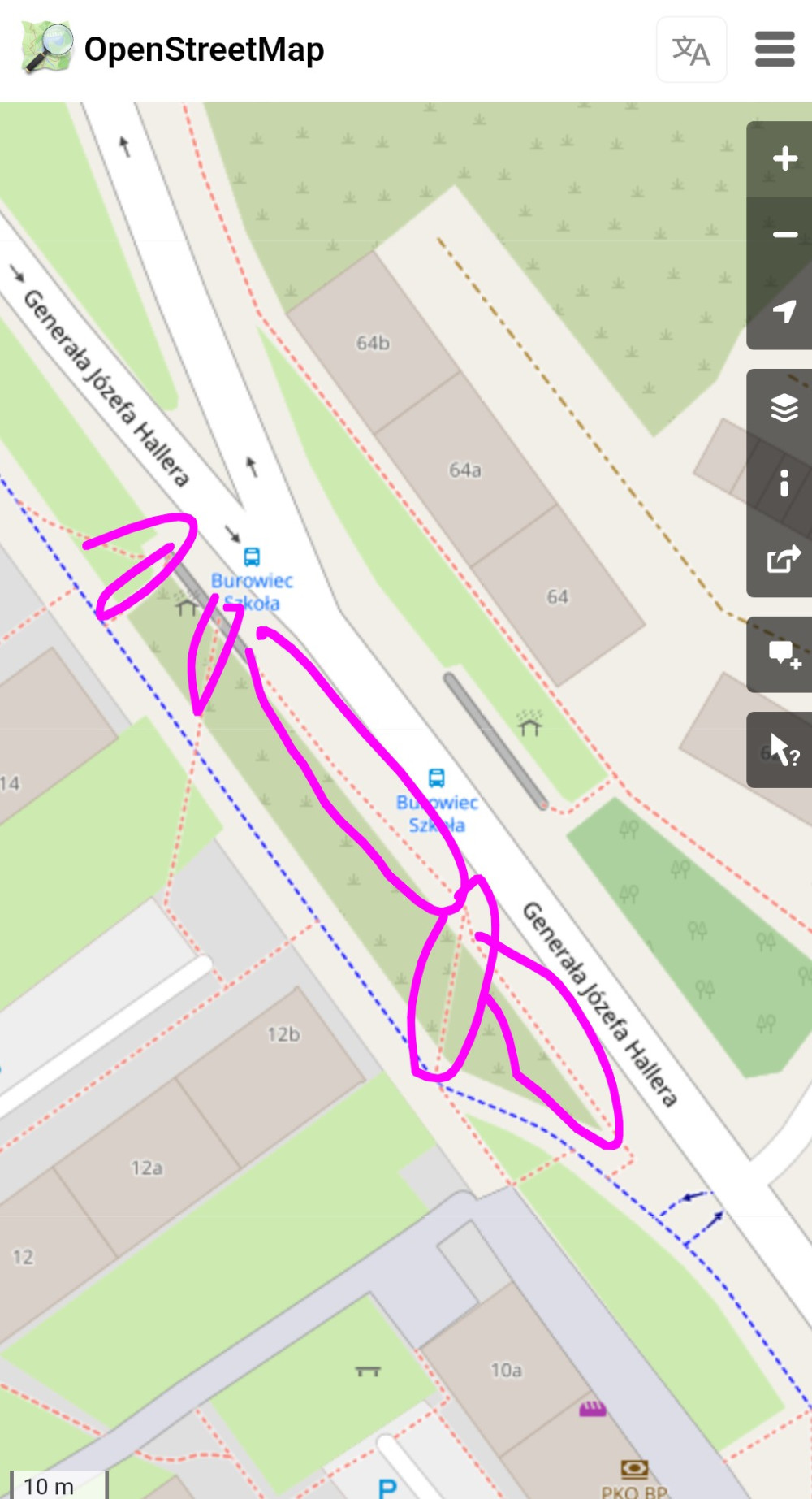 Bardzo prosimy o usunięcie trawy z chodników zaznaczonych na mapce. Chodniki najprawdopodobniej w zarządzie generalnej dyrekcji dróg krajowych i autostrad która nigdy w tym miejscu nie usuwa trawy z chodnika. Prosimy o cykliczne usuwanie trawy w tym miejscu