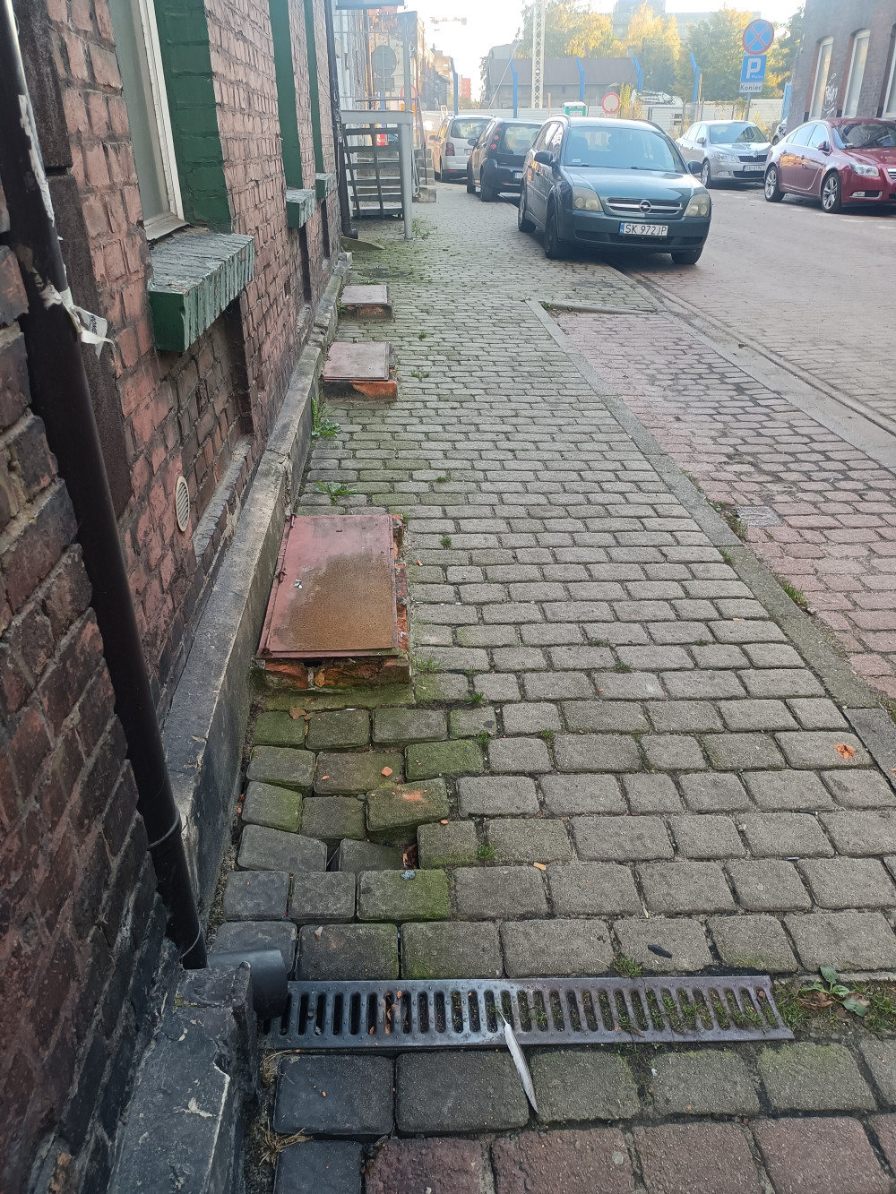 Proszę o naprawę chodnika zapadniętego przy ujściu rynny budynku Paderewskiego 1.