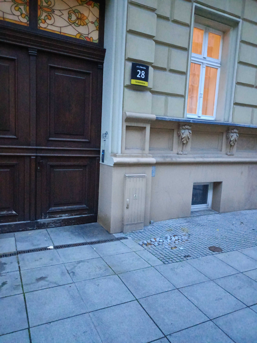 Proszę o naprawę rozsypanych kostek przy budynku Mariacka 28.