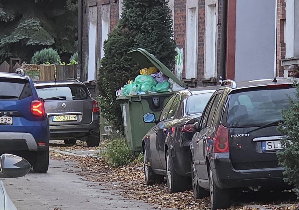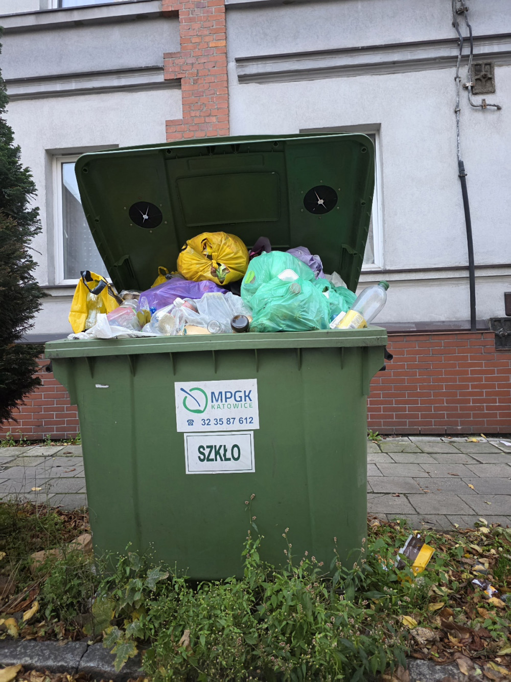 DO MPGK - szkło - od trzech tygodni całkowicie przesypany zielony pojemnik na szkło stoi na pasie zieleni - proszę o opróżnienie wtedy będzie mógł wrócić na posesję.
