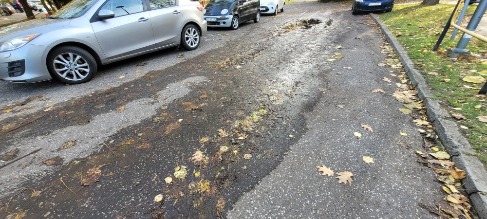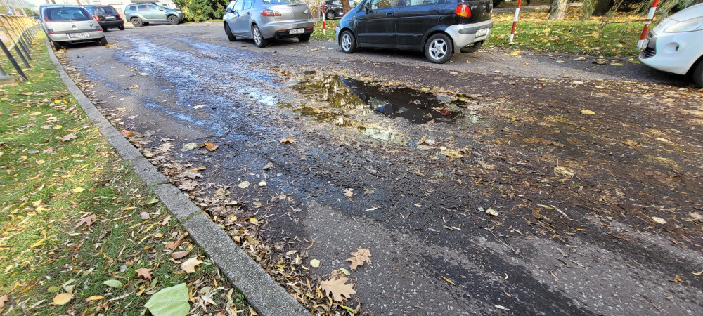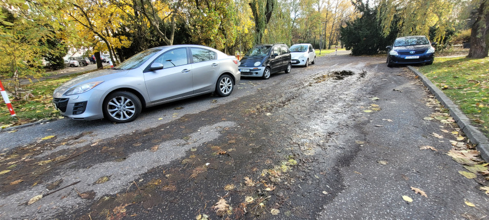 Droga do parku Hallera- krzywa nawierzchnia, dużo kałuż, spadają liście z drzew które nie są pielęgnowane, zapomniana alejka, proszę o uprzątnięcie kałuż, błota i lisci