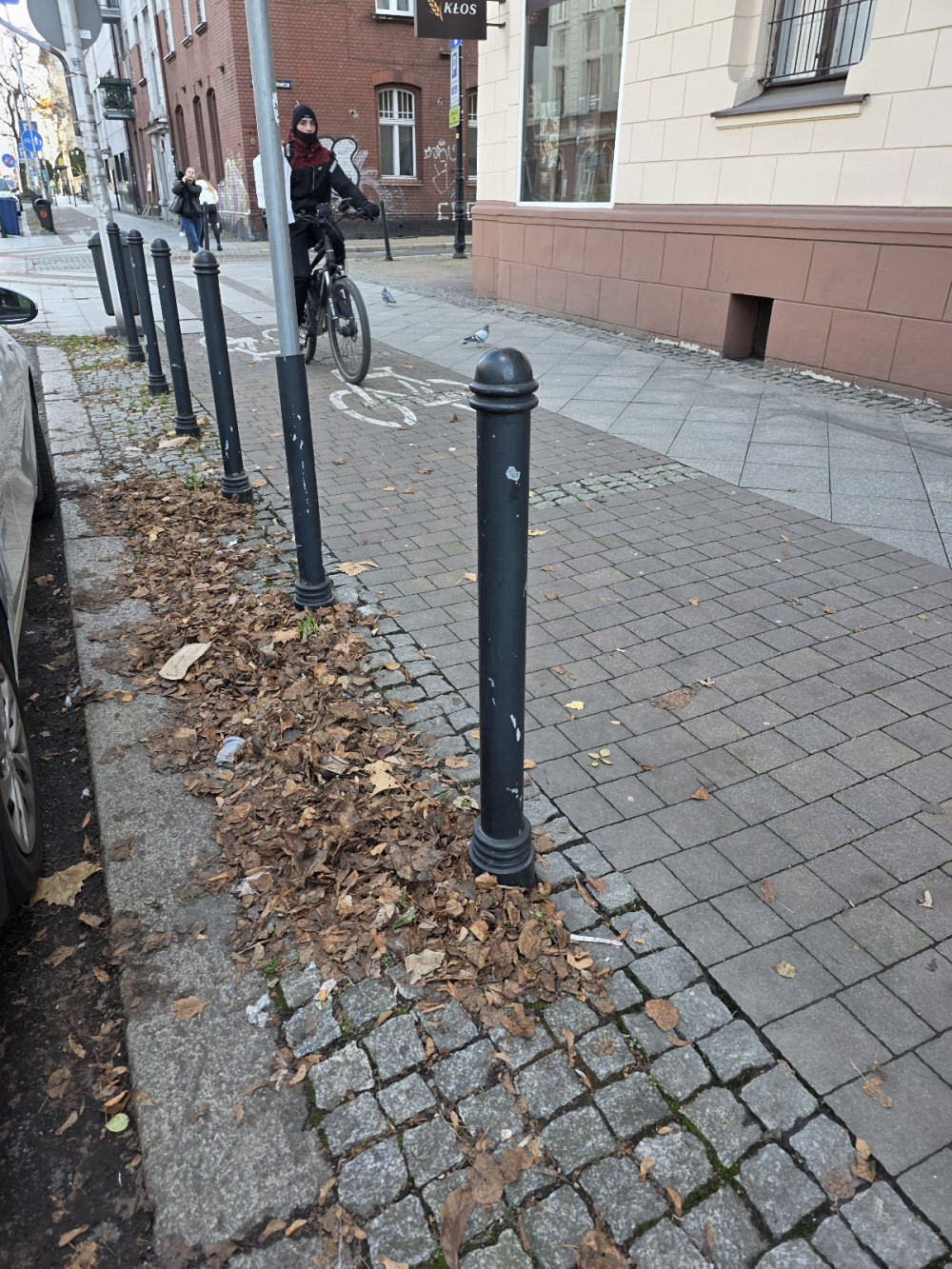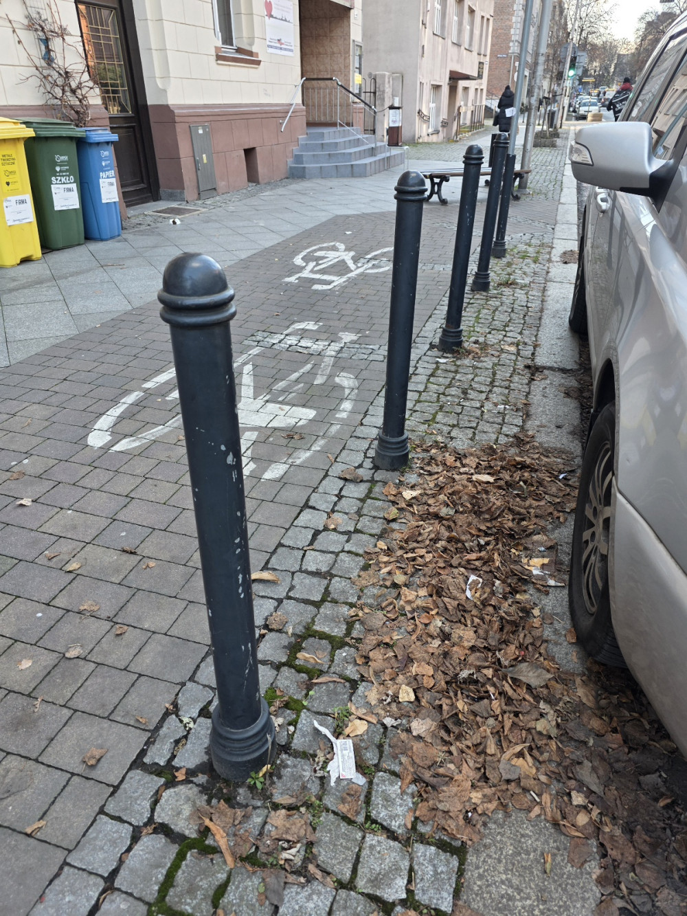 Jagielonska. Do MPGK dla czystej estetyki zgłaszam to miejsce, między słupkami a jezdnią NIE dociera wasz samochodzik - zamiatarka, który jak widać zamiata ścieżkę rowerową. Proszę o posprzątanie przyklejonej do chodnika breji z liśćmi i śmieciami.